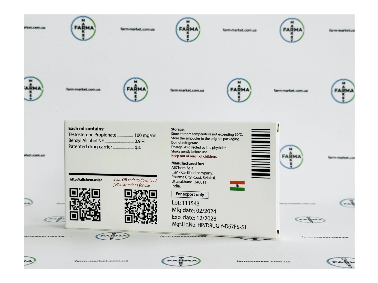 У нашому онлайн магазині доступний для замовлення автентичний тестостерон пропіонат Test100 100 мг в 1 мл, що випускається відомим індійським фармацевтичним брендом Allchem Asia. Вся фарма з їхньої лінійки відповідає передовим глобальним нормам ISO/GMP та високо цінується серед спортсменів в Україні. Як офіційний дистриб'ютор, ми забезпечуємо оригінальність кожної упаковки, тривалі терміни зберігання та оптимальні умови транспортування.